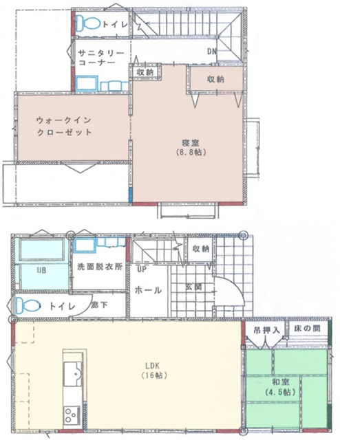 | 間取内容 | 1階LDK16畳 1階和室4.5畳 2階洋室8.8畳 2階S |